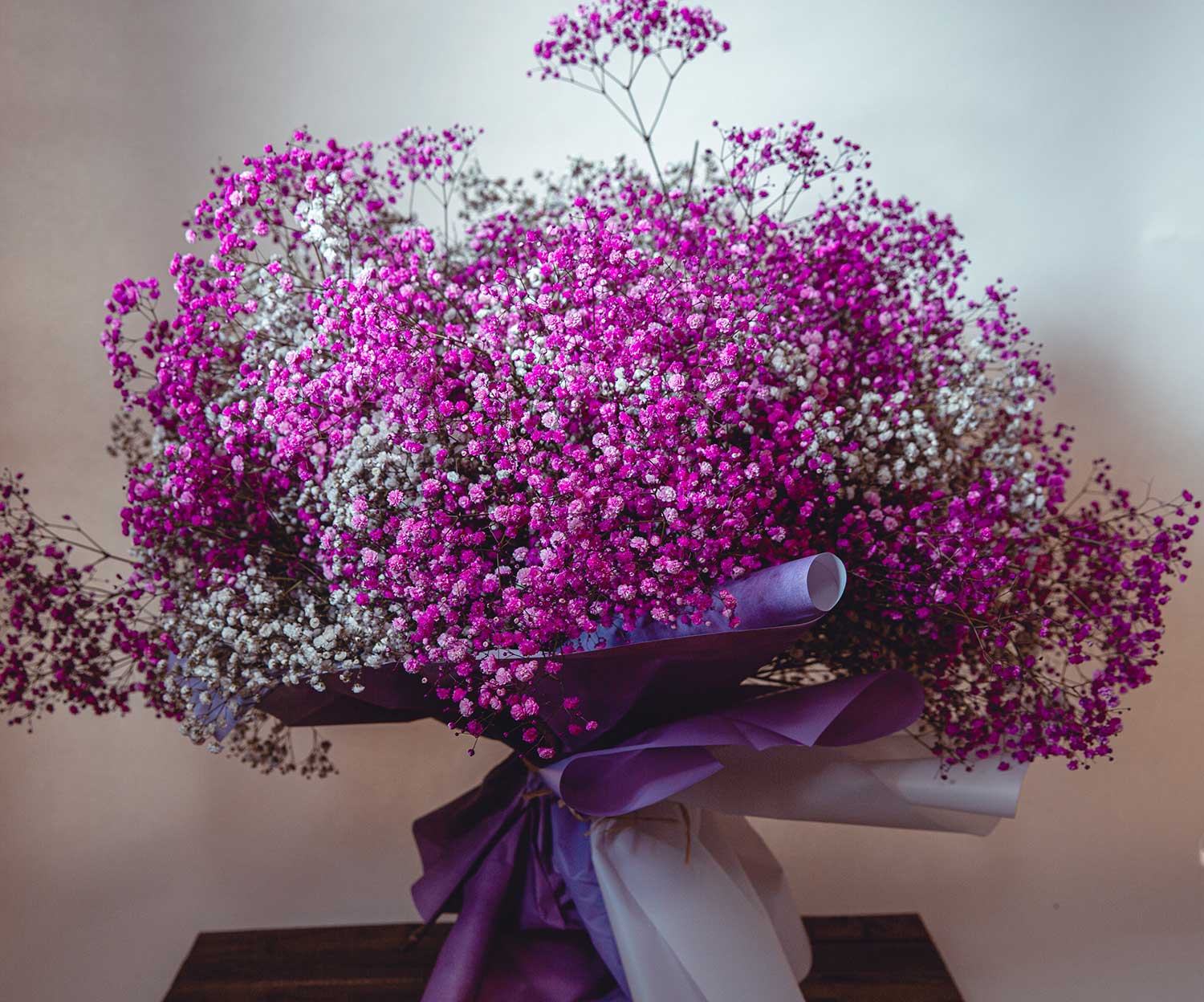 Get lost in wonderment with our Bouquet Cloud arrangement that is made with Baby’s Breath flowers. The cloud-like blossom is wrapped and strung together in a matte paper. Our design transforms the traditional Baby’s Breath bouquet into an exotic package of bewilderment with its light and airy shades of pink.