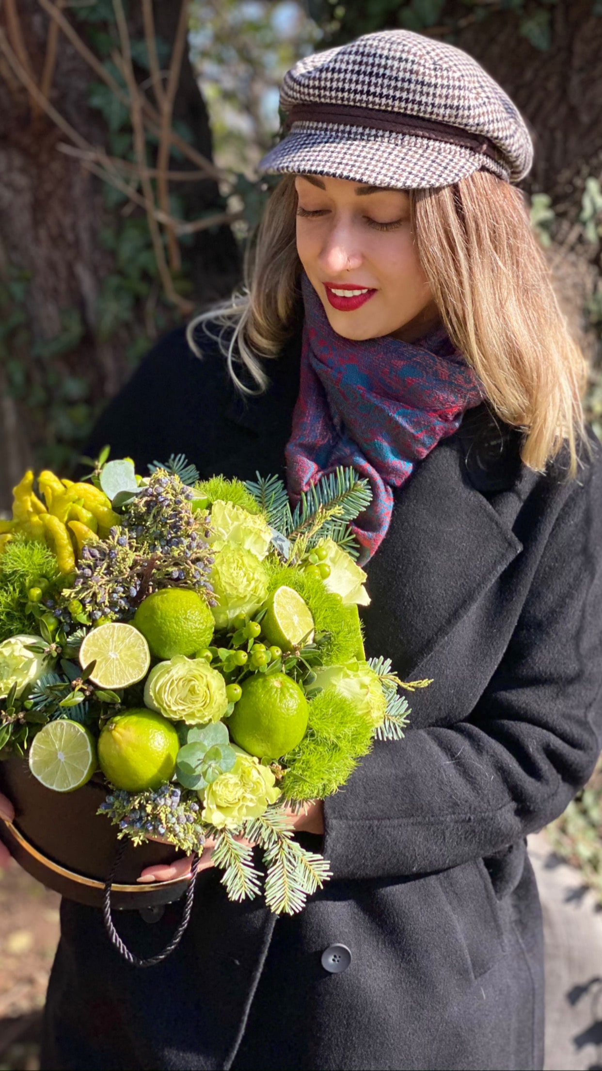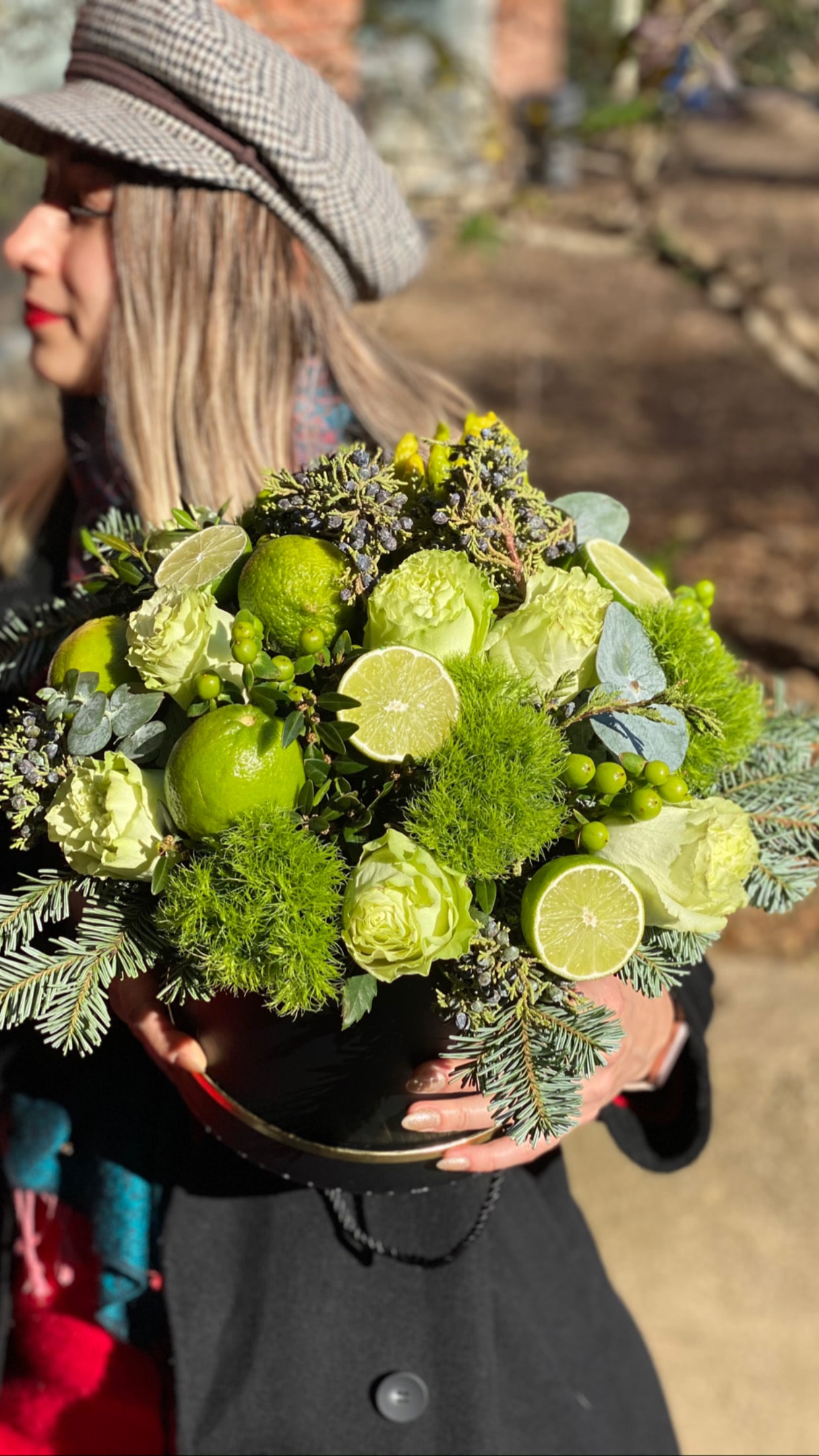 A fresh single color-themed arrangement made with real limes and several assortments of gorgeous green flowers like Lemonade Roses, Green Trix, Lisianthus, Hypericum Berry, Hydrangea Pods, and Parrot Tulips. We always use high-quality flowers to provide our customers with the best aesthetic pleasure.
