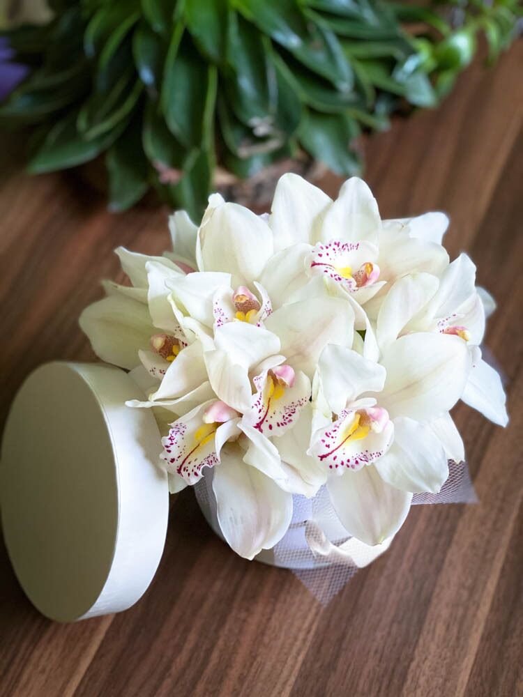 The white Tropical Cymbidium Orchids make a simple yet elegant arrangement. This flower’s bloom is long lasting, perfect for displaying a lasting expression of luxury, love and strength.