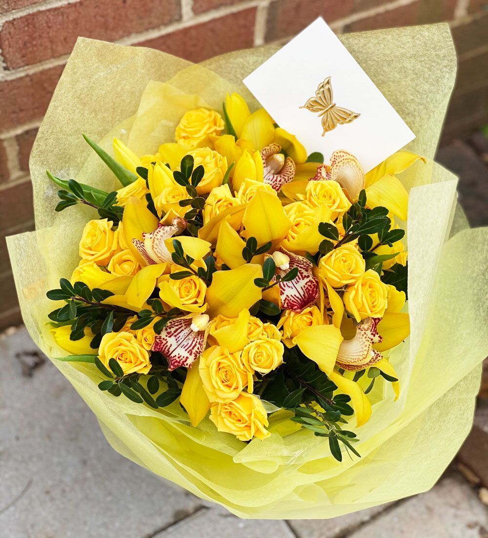 This gorgeous flower arrangement emanates bliss and cheerfulness. It has a variety of yellow flowers such as Cymbidium Orchids, Garden and Spray Roses, Craspedia, Bunny Tails, Sunflowers, and Tulips. This piece is perfect for any occasion – like welcoming a little more Sun to brighten the day.